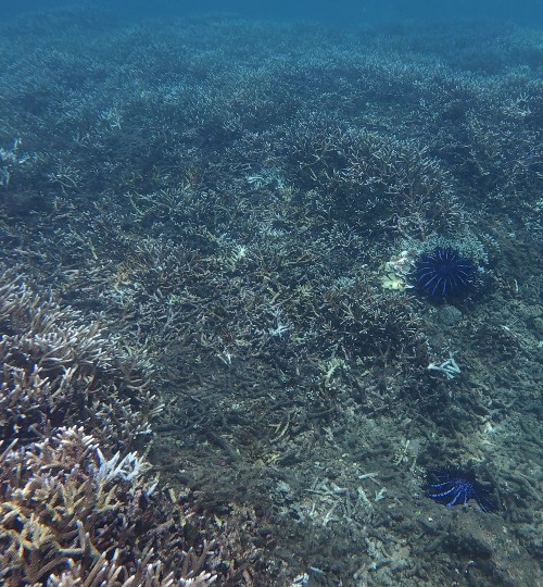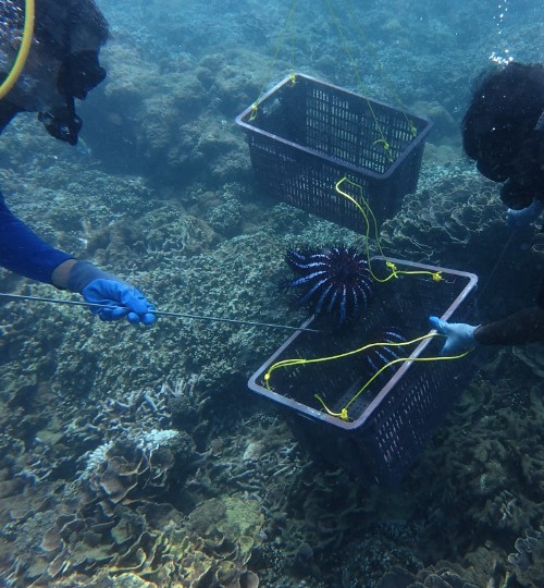 Divers extracted the COTs while ensuring minimal harm to the corals. Over two days of extensive removal, 107 COTs were extracted, transported to shore, and buried to avoid risk to land animals and humans. Observations clearly showed that this effort was effective, as evidenced by the decrease in the starfish density as well as the reduced COTs-related bleaching and mortality on the reef.
